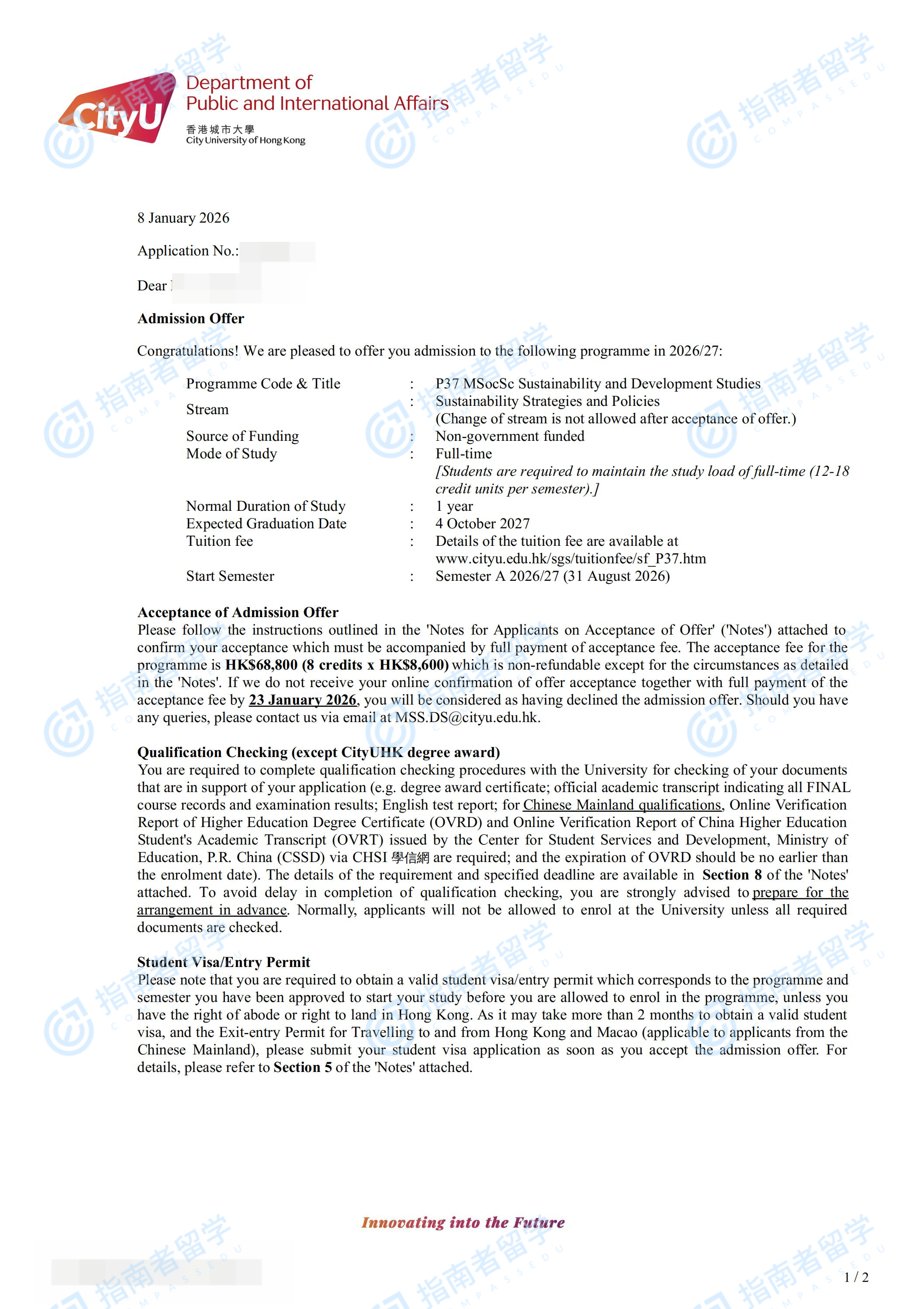 香港城市大学可持续与发展研究社会科学硕士研究生offer一枚