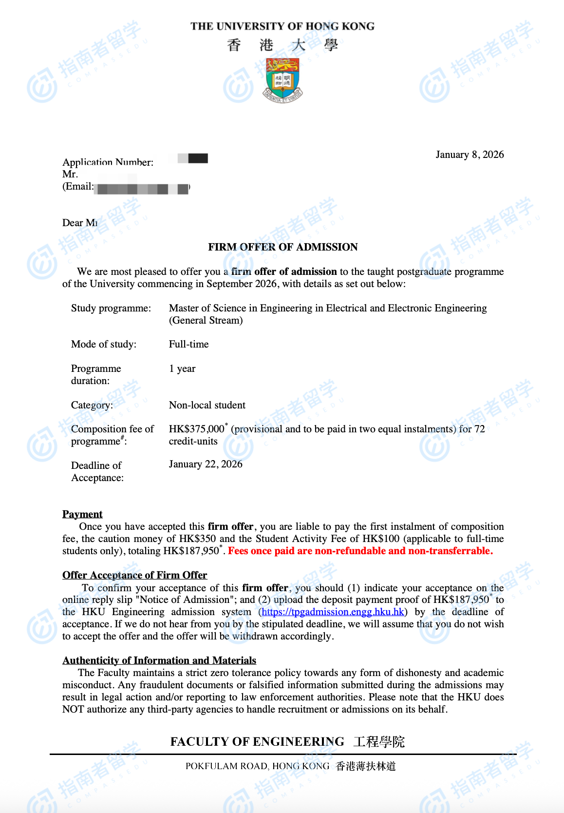 香港大学电气与电子工程(工程)理学硕士 - 常规方向研究生offer一枚