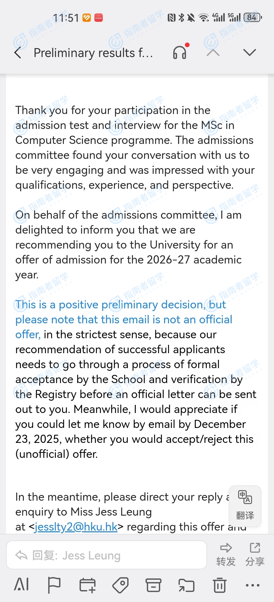 香港大学计算机科学理学硕士(常规方向)研究生offer一枚