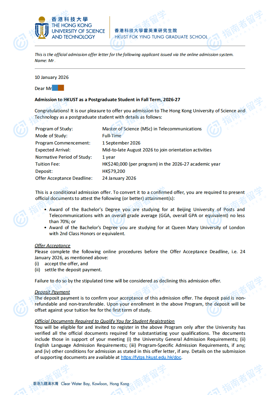 香港科技大学电信学理学硕士研究生offer一枚