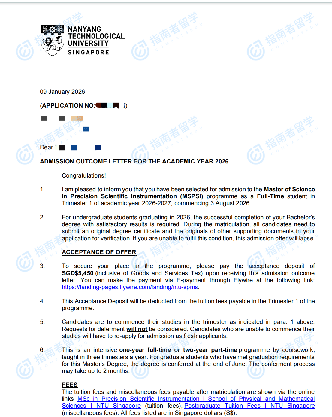 南洋理工大学精密科学仪器理学硕士研究生offer一枚