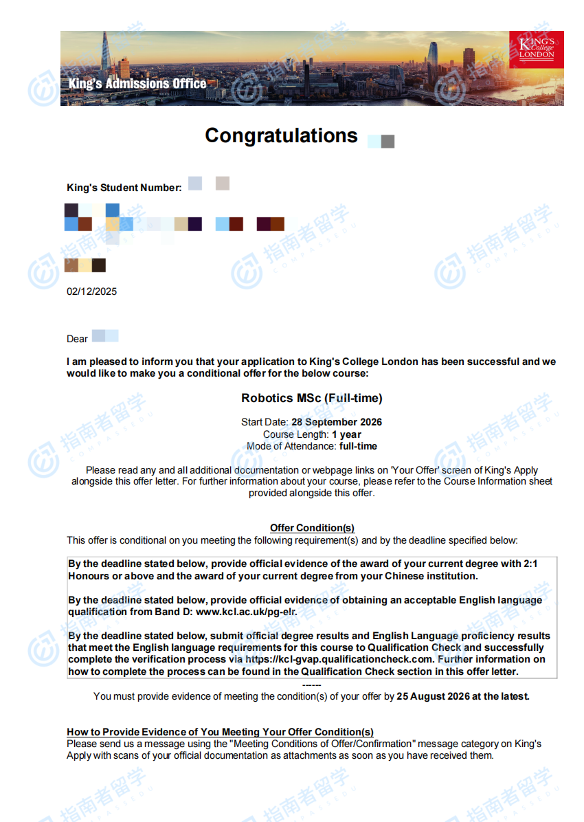 伦敦大学国王学院机器人学理学硕士研究生offer一枚