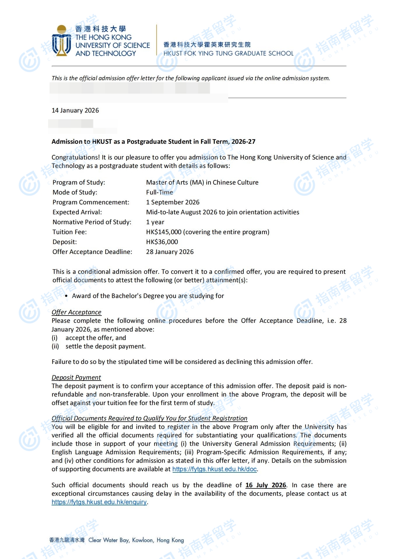 香港科技大学中国文化文学硕士研究生offer一枚