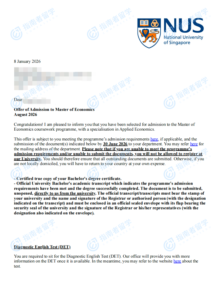 新加坡国立大学经济学硕士研究生offer一枚