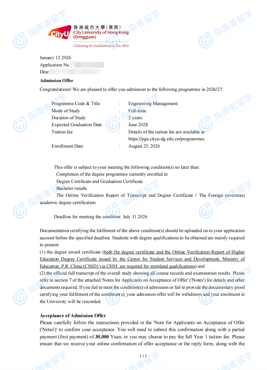 香港城市大学工程管理学理学硕士(CityU-DG)研究生offer一枚