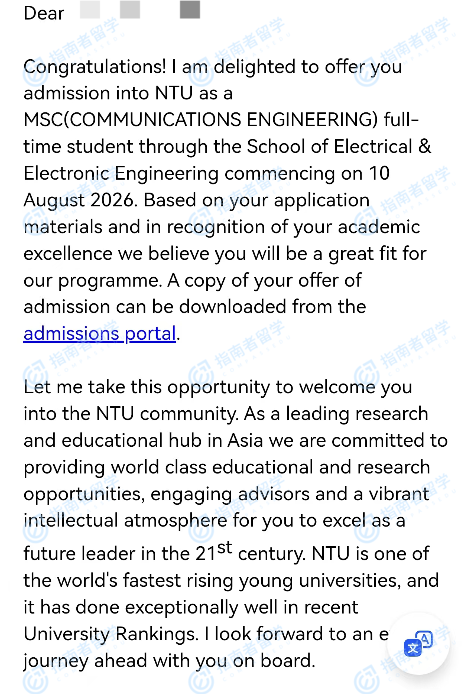 南洋理工大学通信工程理学硕士研究生offer一枚