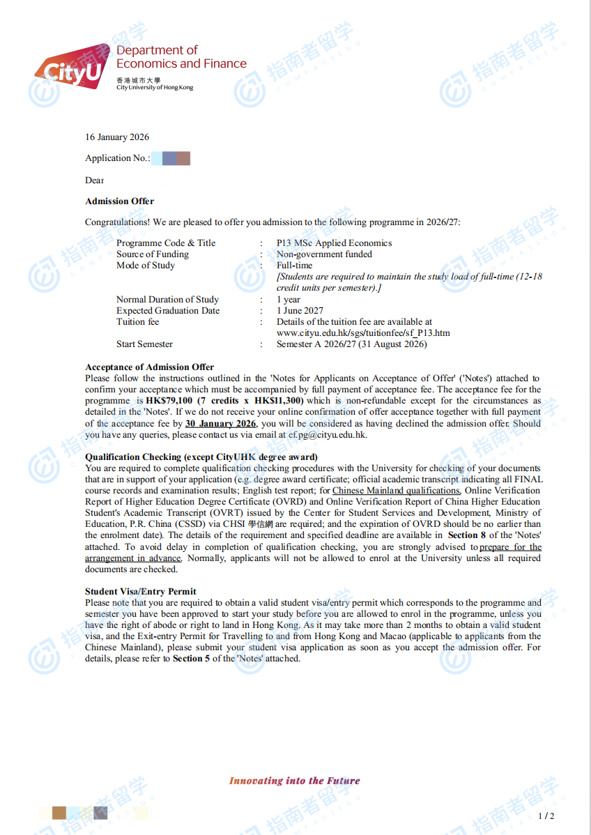 香港城市大学应用经济学理学硕士研究生offer一枚