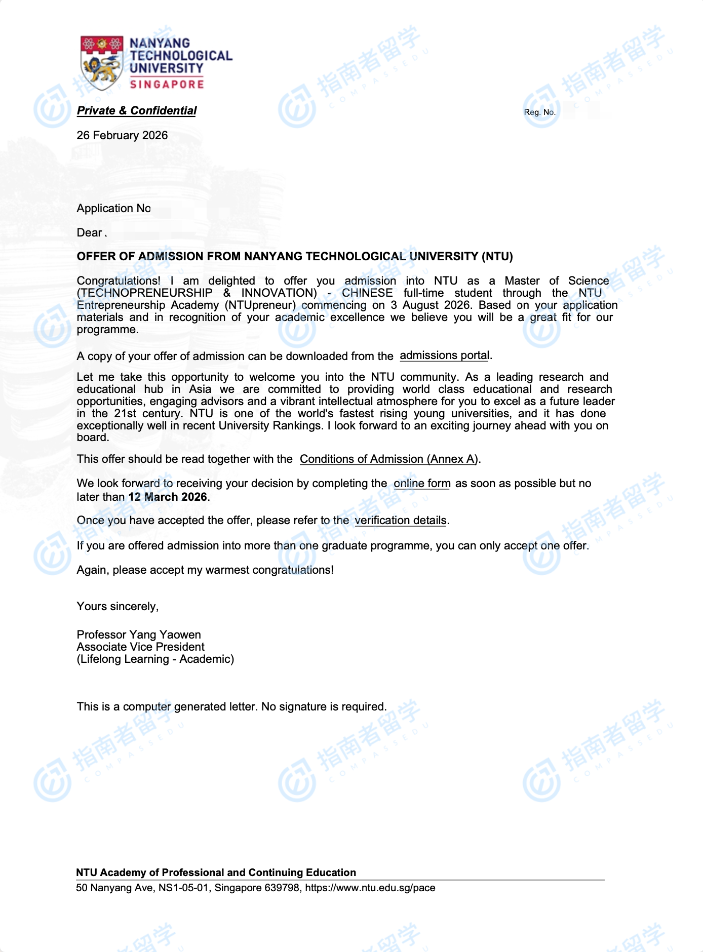 南洋理工大学科技创业与创新理学硕士(中文授课)研究生offer一枚