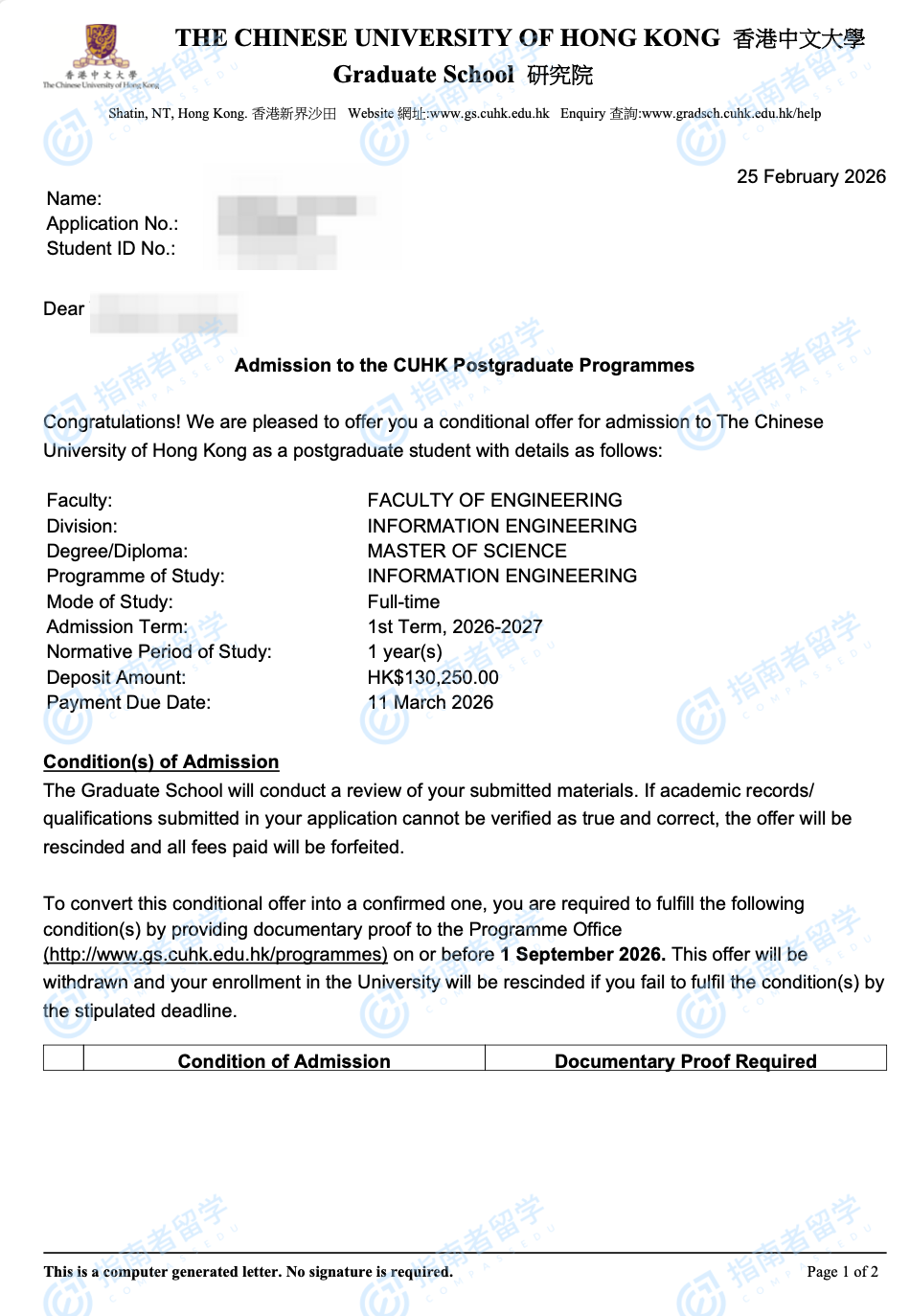 香港中文大学信息工程理学硕士研究生offer一枚