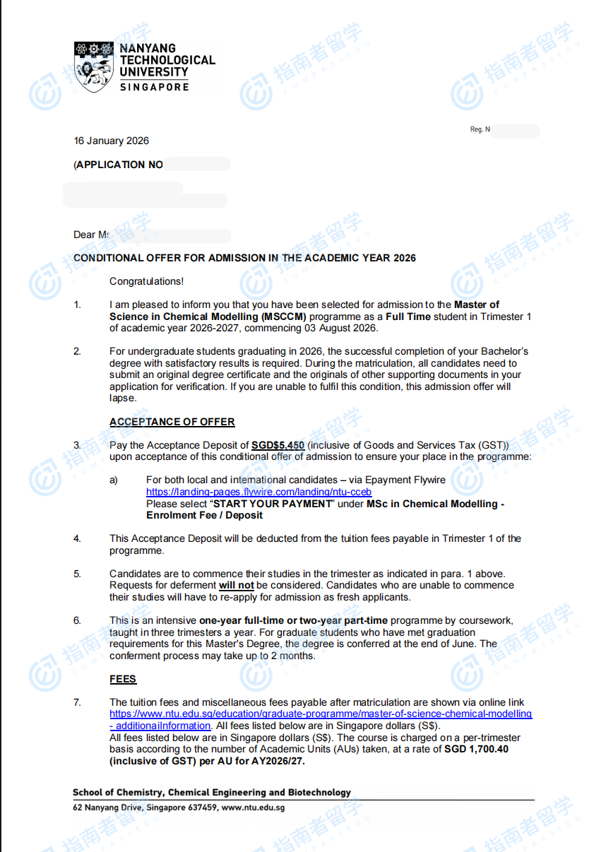 南洋理工大学化学建模理学硕士研究生offer一枚