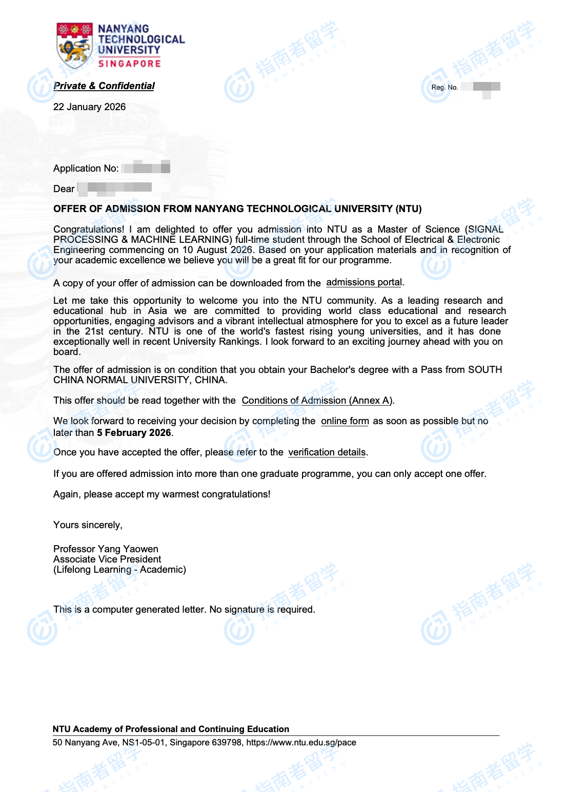 南洋理工大学信号处理和机器学习理学硕士研究生offer一枚