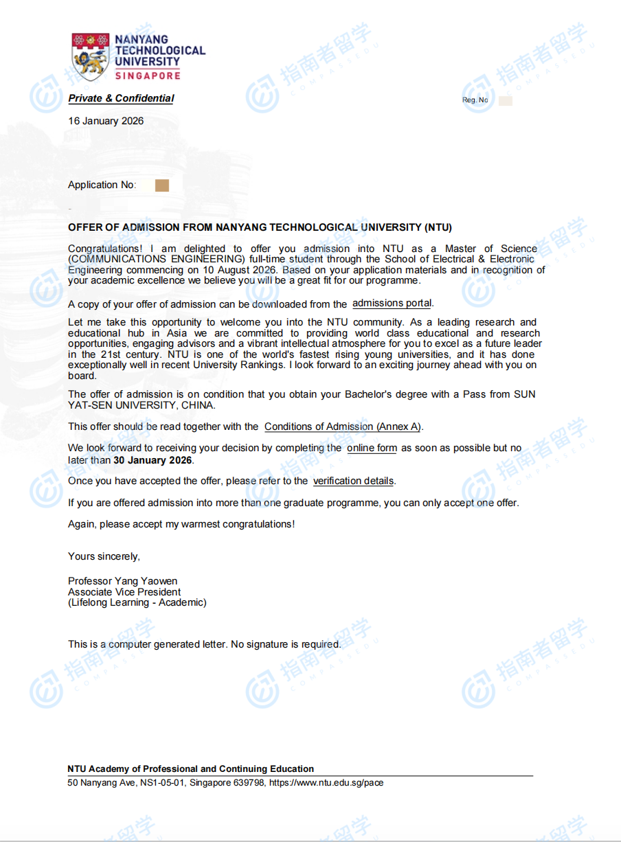 南洋理工大学通信工程理学硕士研究生offer一枚