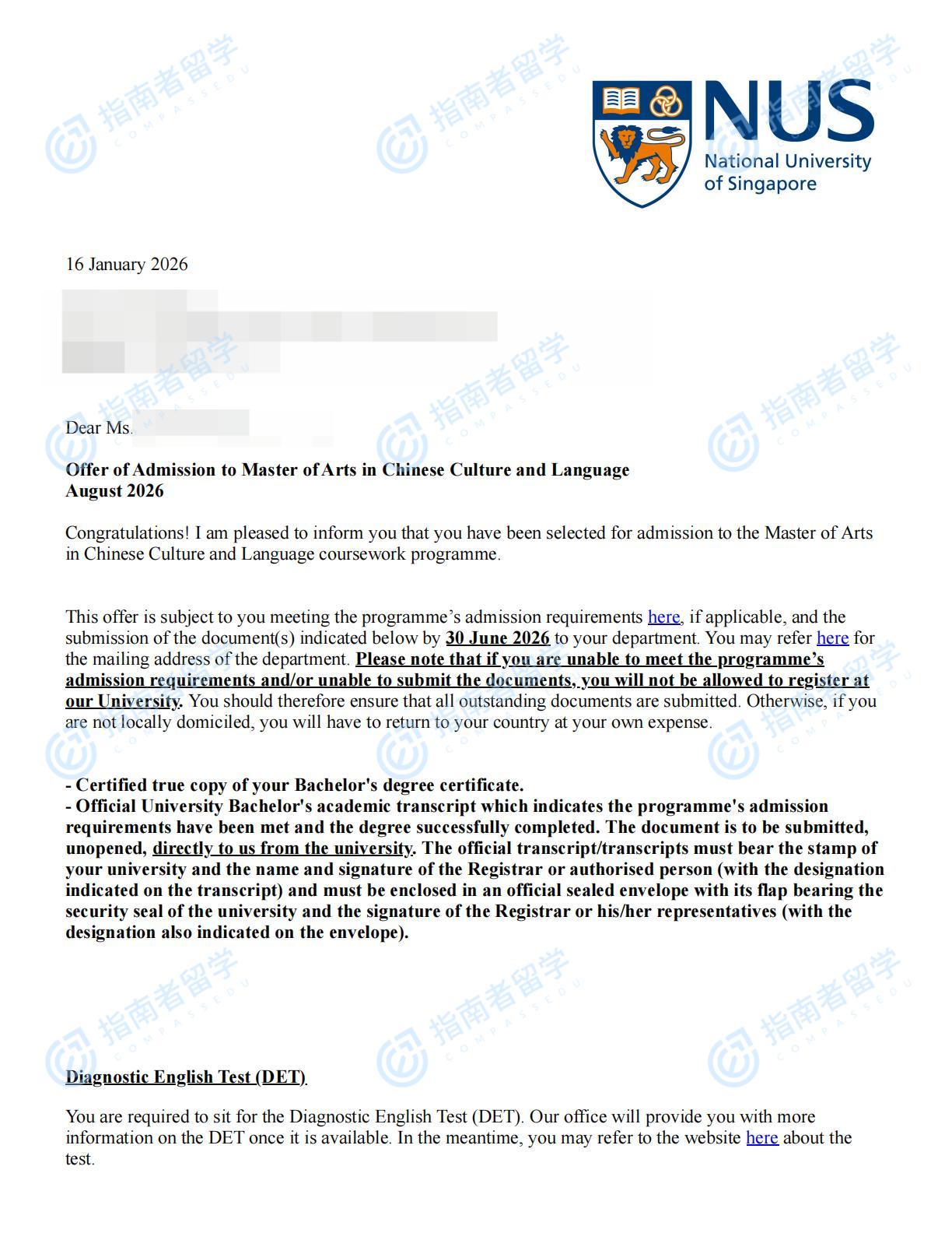 新加坡国立大学中国文化与语言文学硕士研究生offer一枚