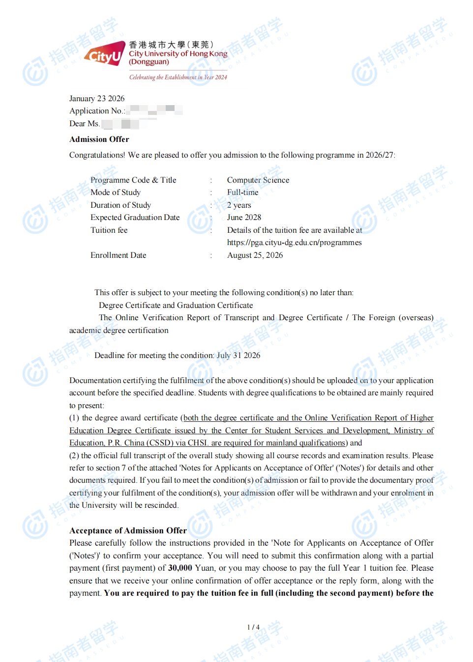 香港城市大学电脑科学理学硕士(CityU-DG)研究生offer一枚