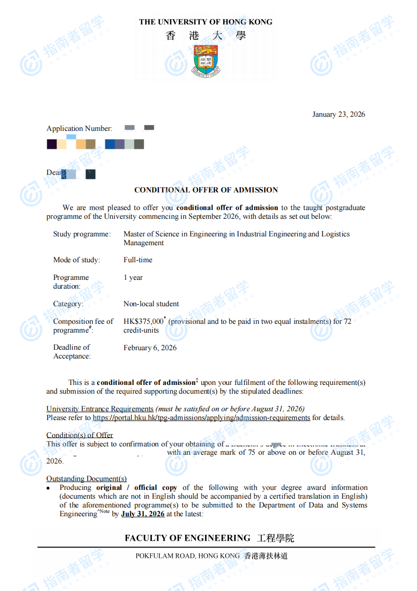 香港大学工业工程与物流管理(工程)理学硕士研究生offer一枚