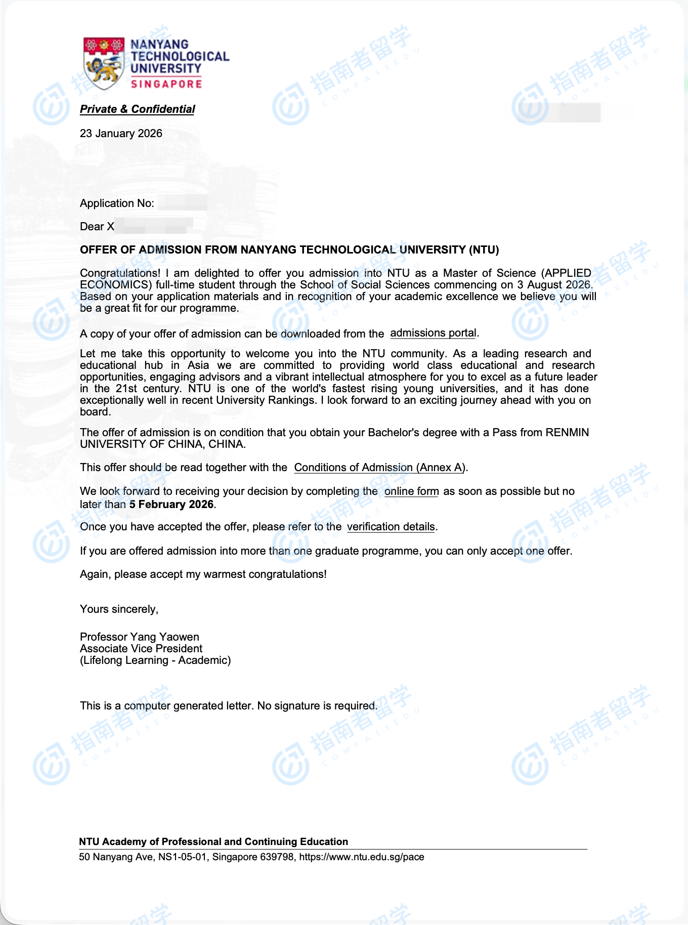 南洋理工大学应用经济学理学硕士研究生offer一枚