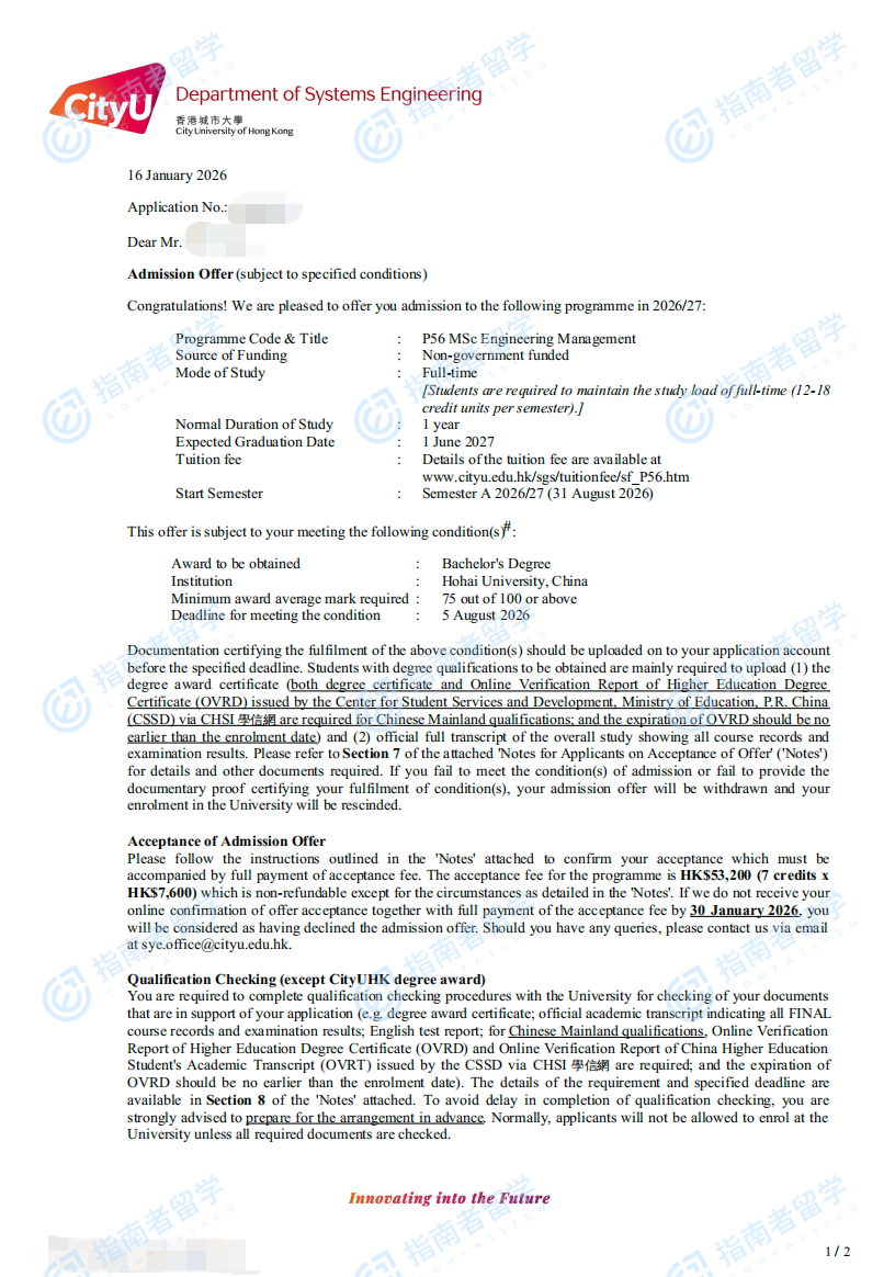 香港城市大学工程管理学理学硕士研究生offer一枚