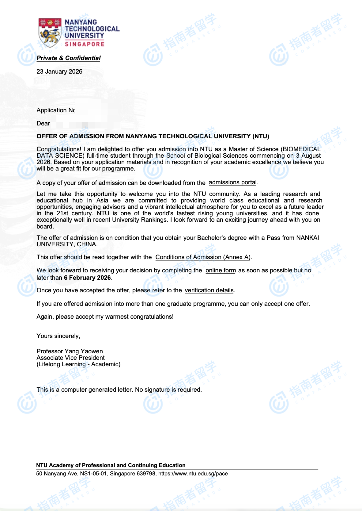 南洋理工大学生物医学数据科学理学硕士研究生offer一枚