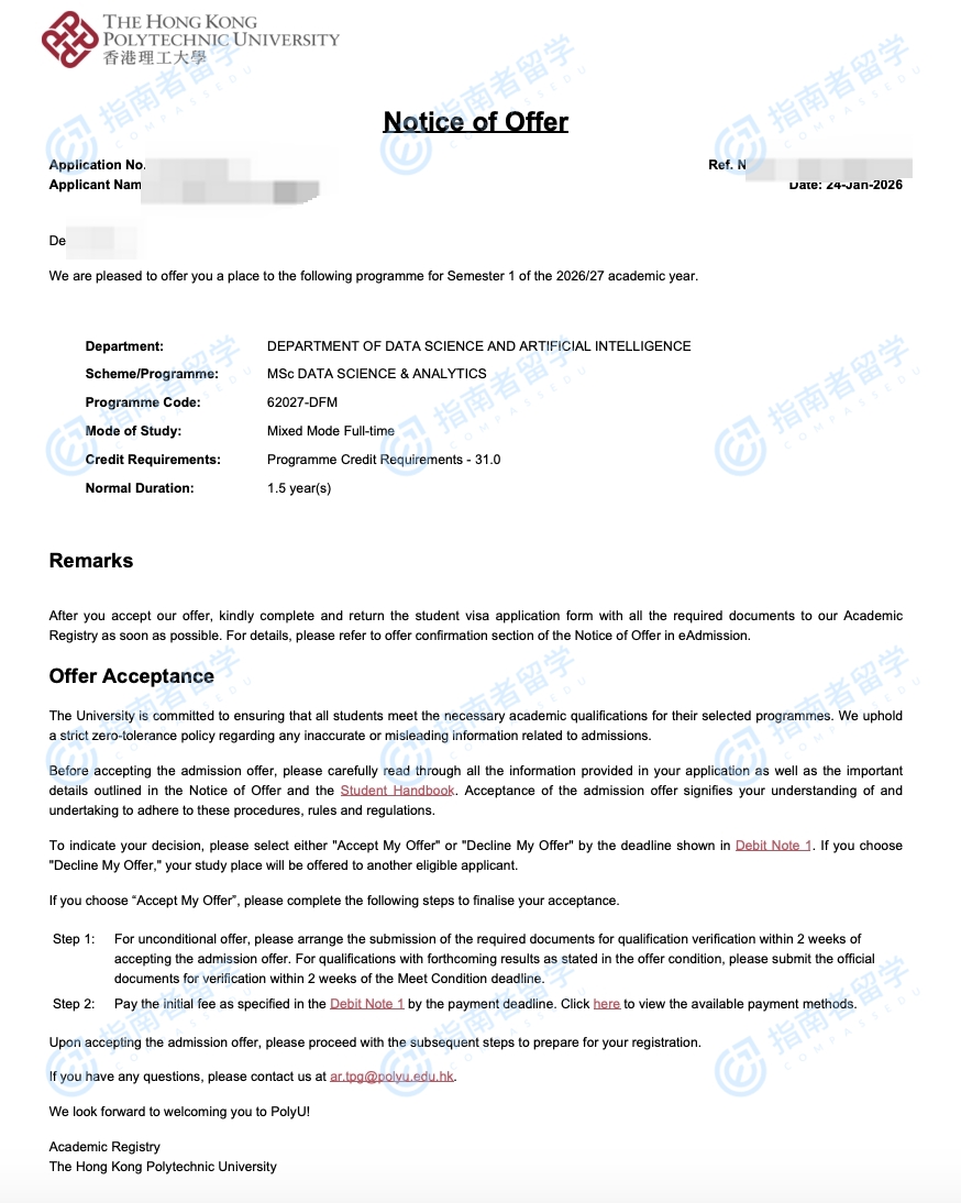 香港理工大学数据科学及分析理学硕士研究生offer一枚