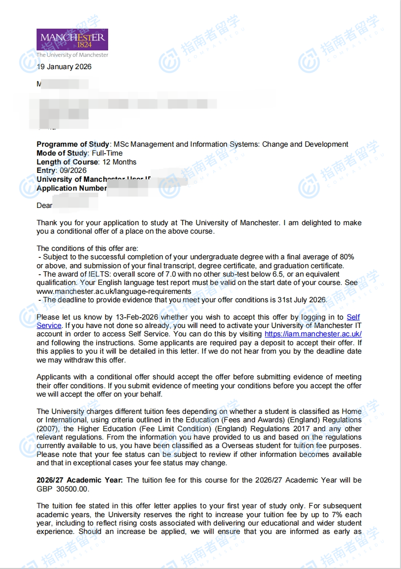 曼彻斯特大学管理与信息系统:变化与发展理学硕士研究生offer一枚