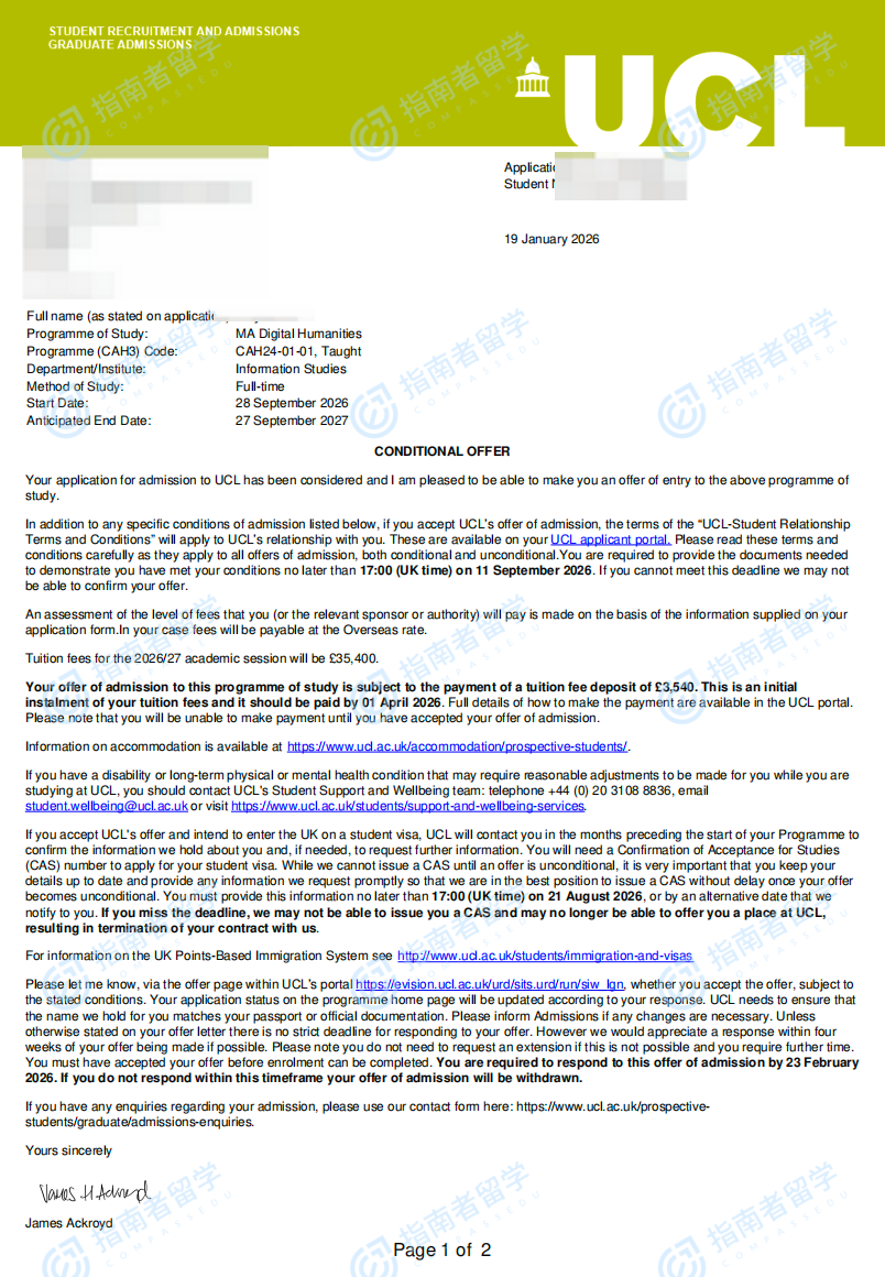 伦敦大学学院数字人文文学硕士研究生offer一枚