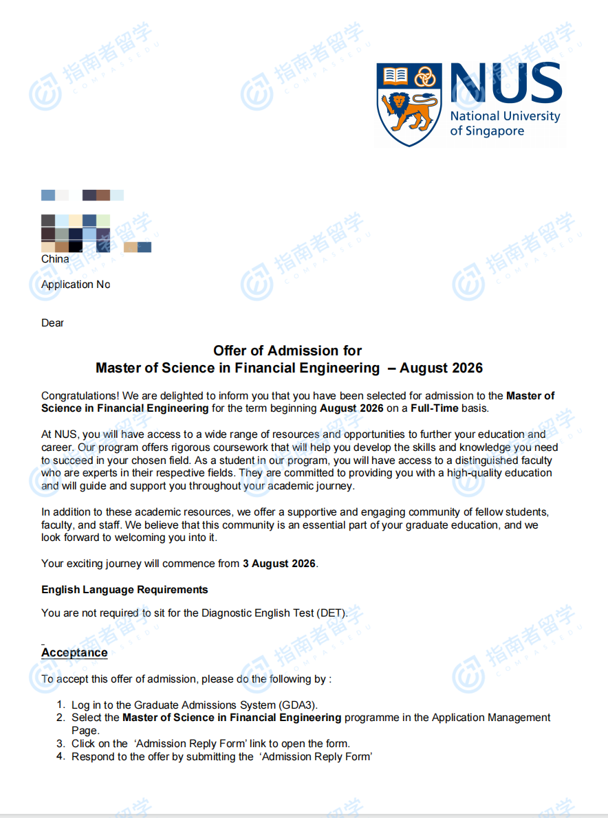 新加坡国立大学金融工程理学硕士研究生offer一枚