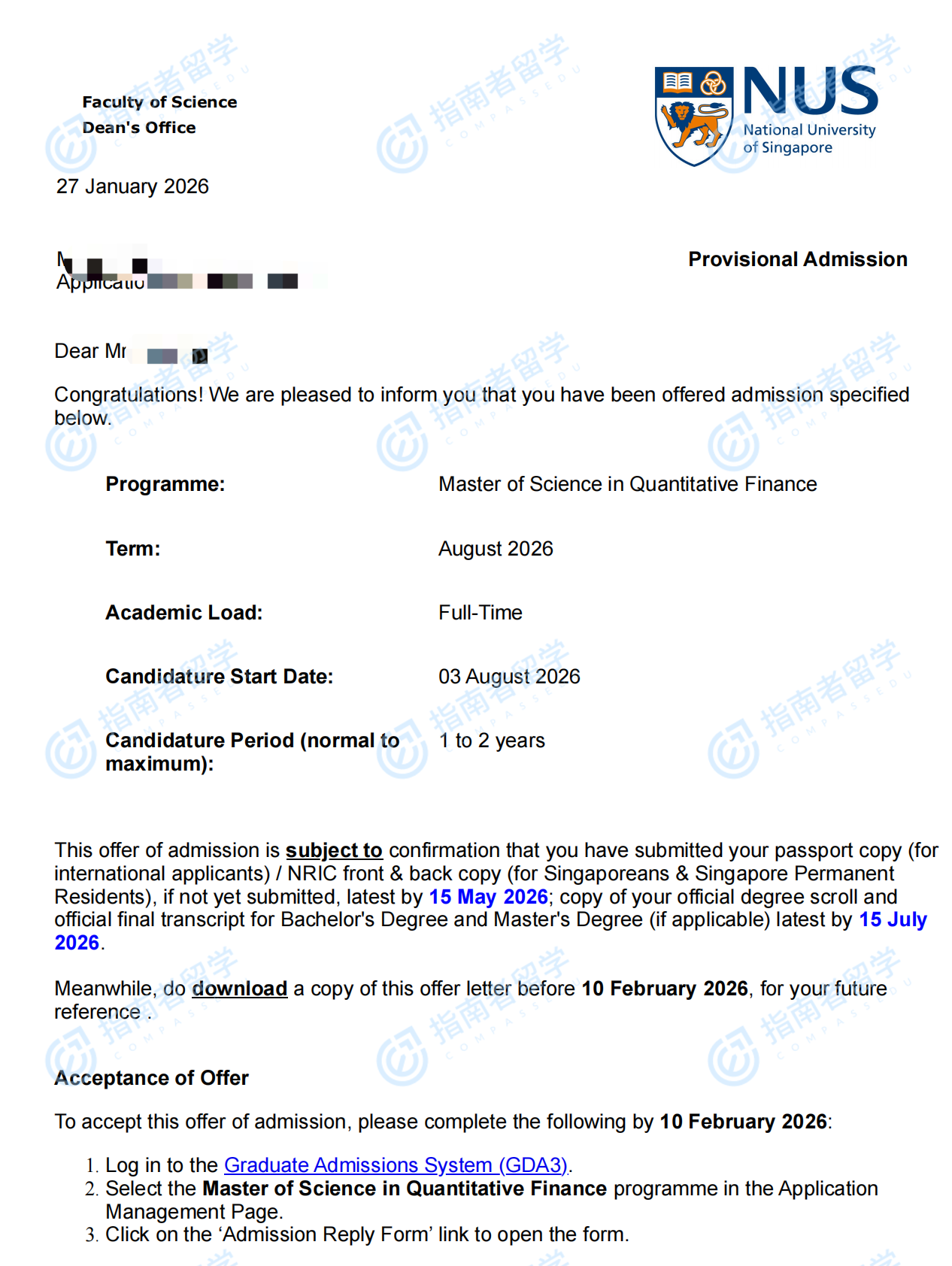 新加坡国立大学定量金融理学硕士研究生offer一枚