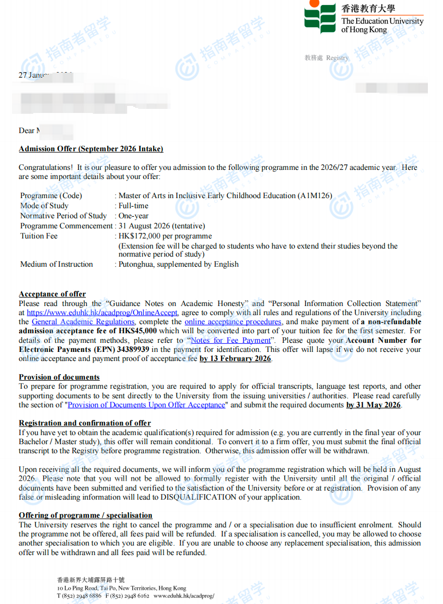 香港教育大学幼儿融合教育文学硕士研究生offer一枚