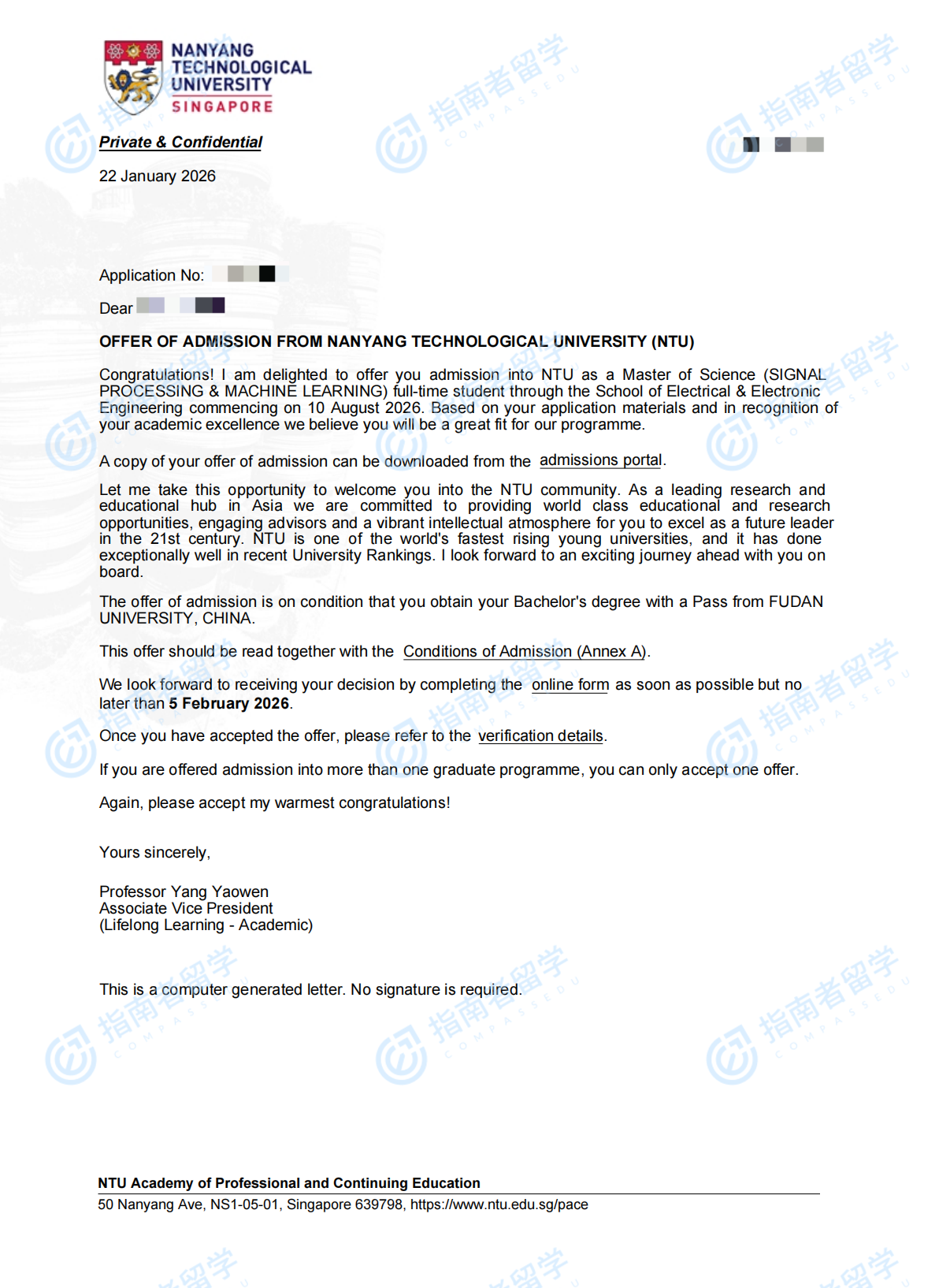 南洋理工大学信号处理和机器学习理学硕士研究生offer一枚