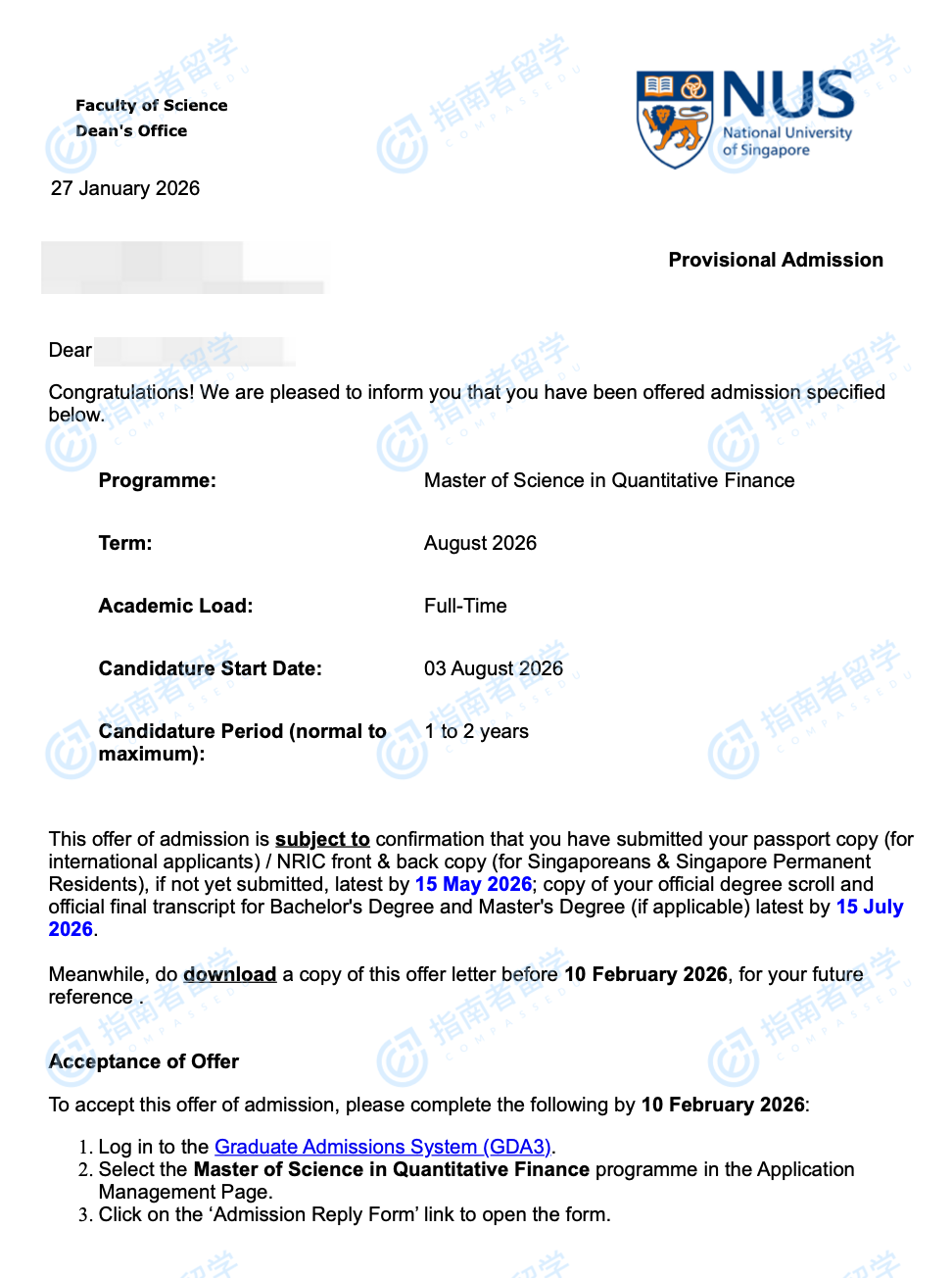 新加坡国立大学定量金融理学硕士研究生offer一枚