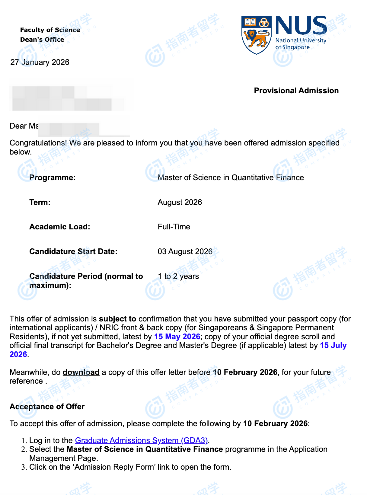 新加坡国立大学定量金融理学硕士研究生offer一枚