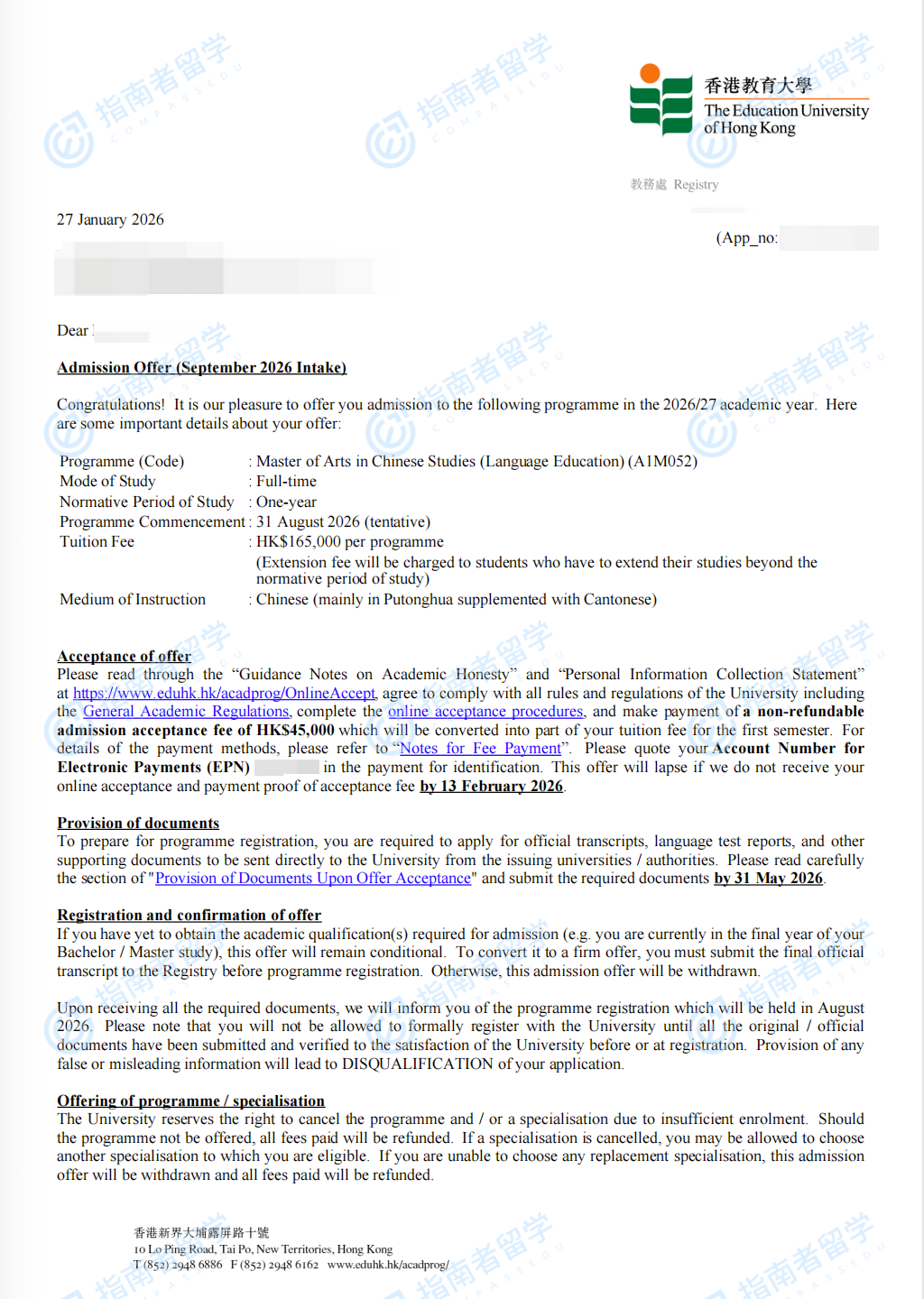 香港教育大学中文研究文学硕士(语文教育)研究生offer一枚