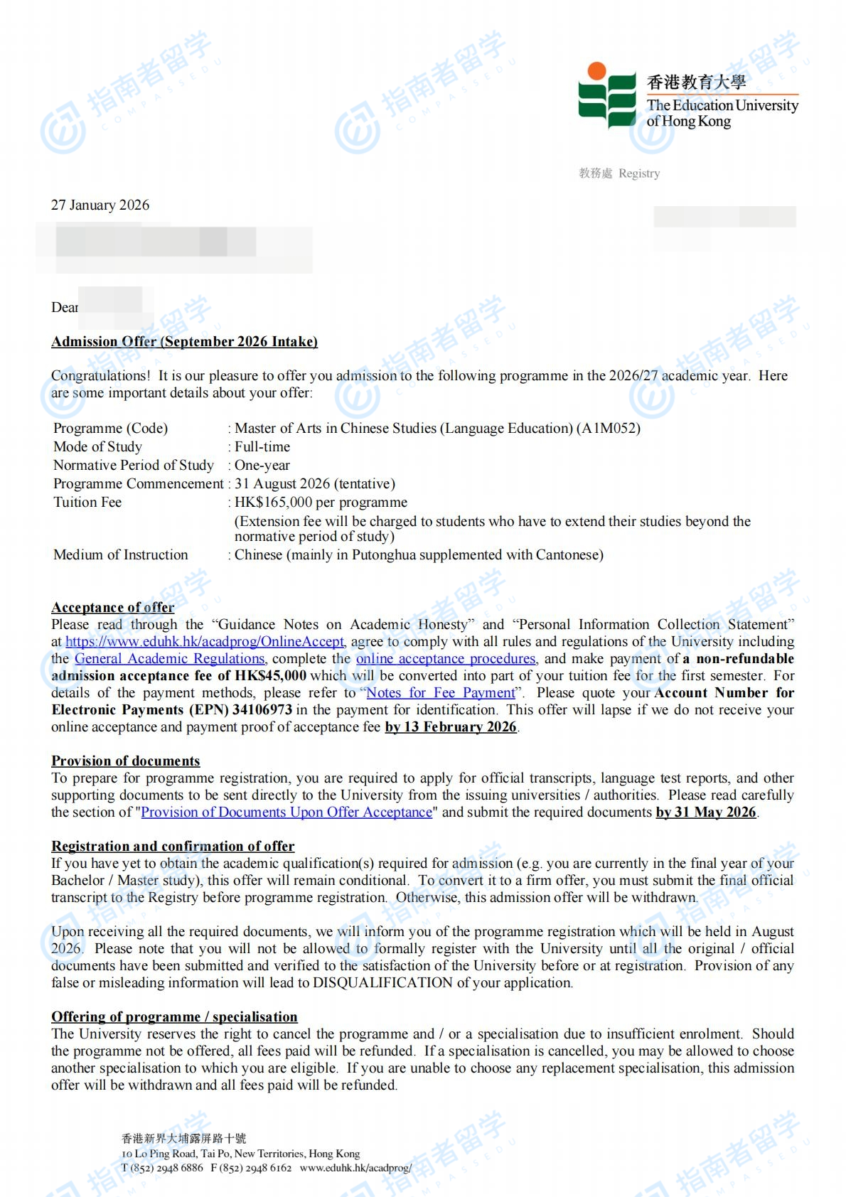香港教育大学中文研究文学硕士(语文教育)研究生offer一枚