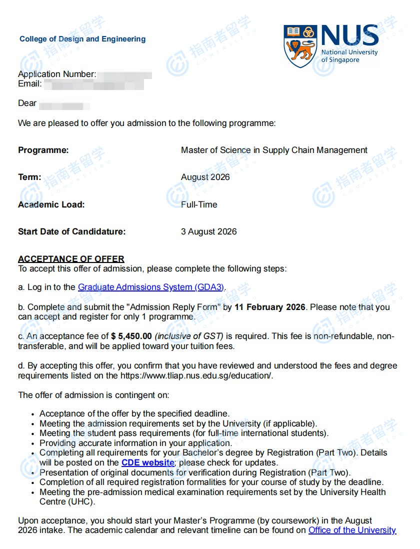 新加坡国立大学供应链管理理学硕士研究生offer一枚
