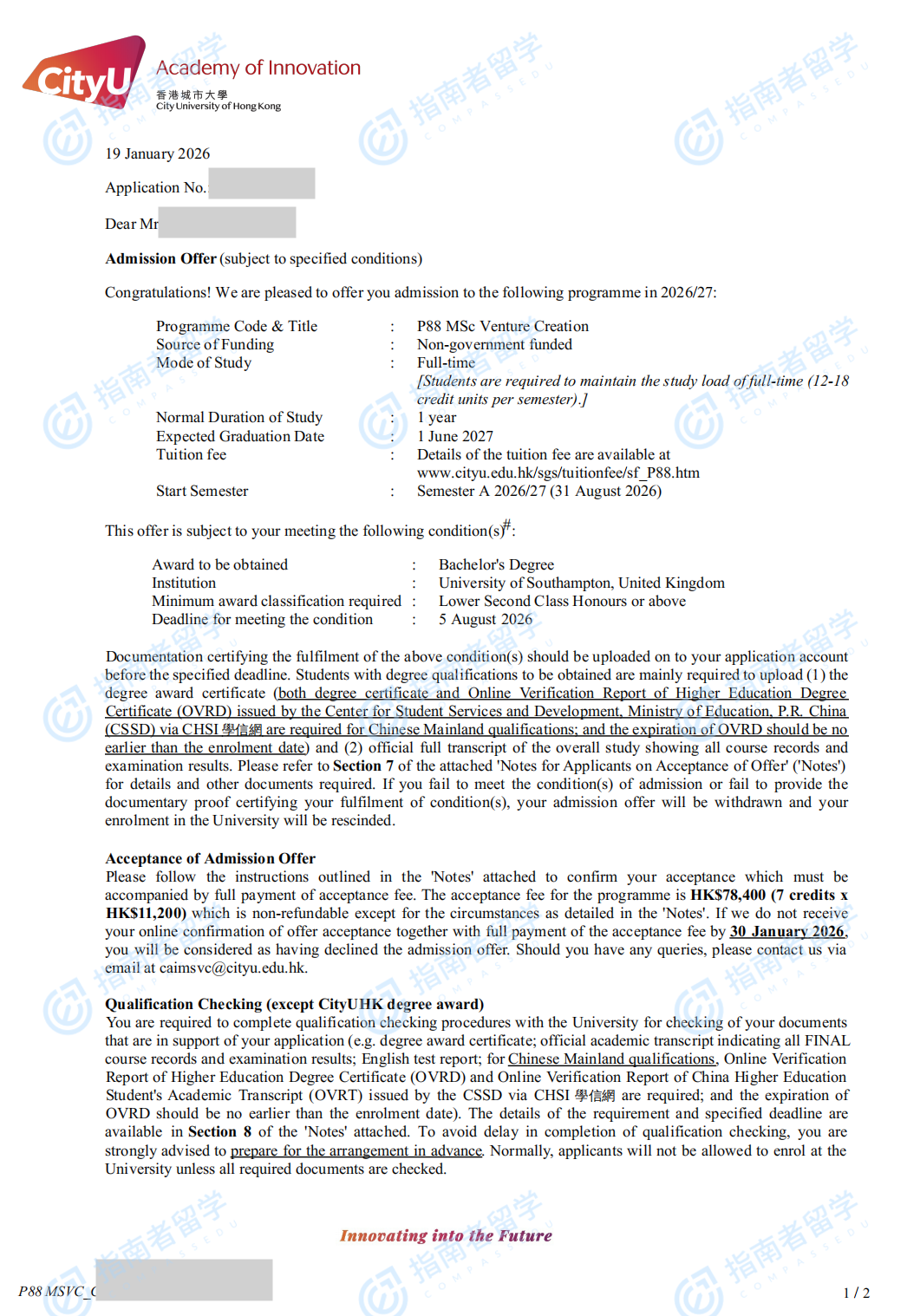 香港城市大学创新创业理学硕士研究生offer一枚