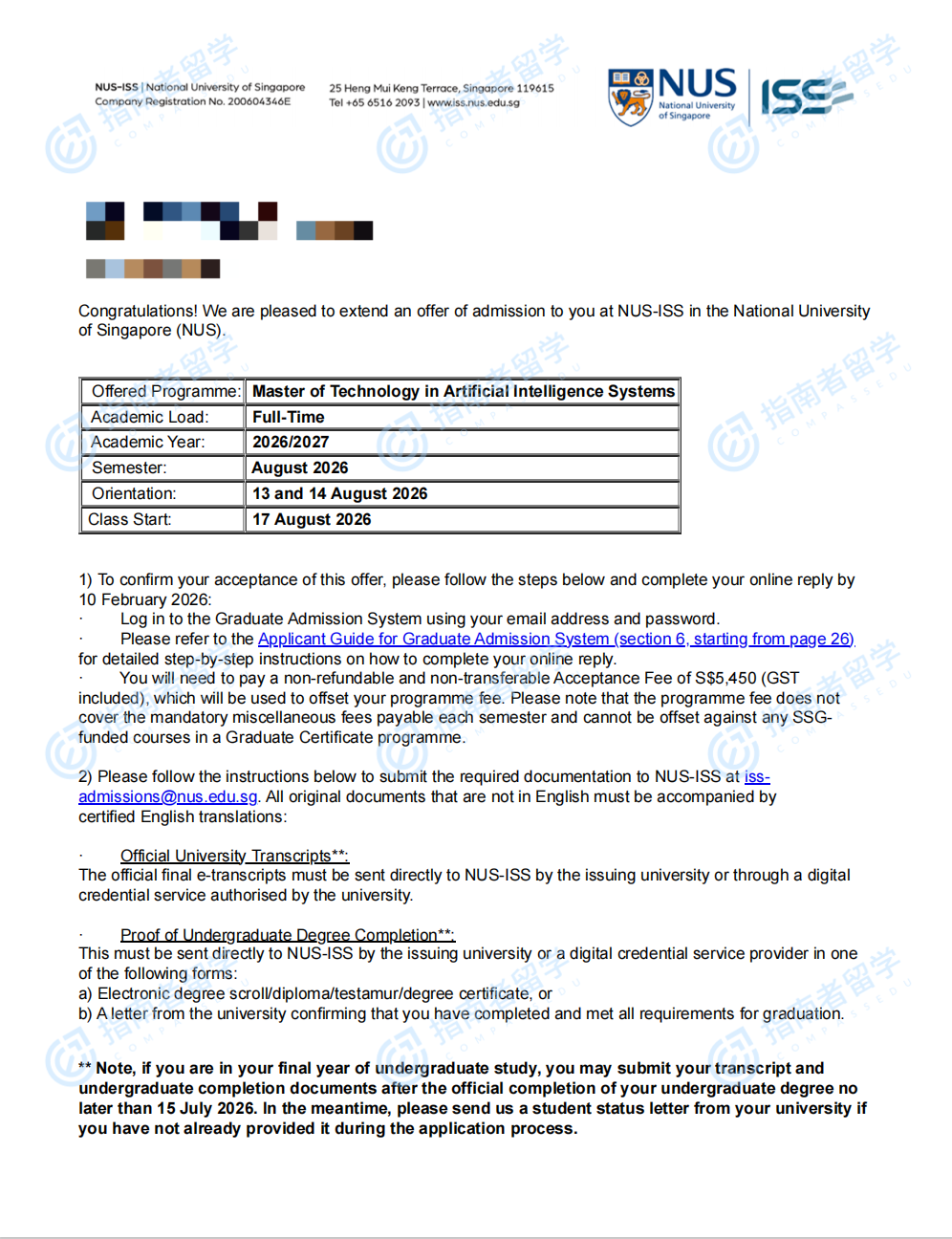 新加坡国立大学人工智能系统科技硕士研究生offer一枚