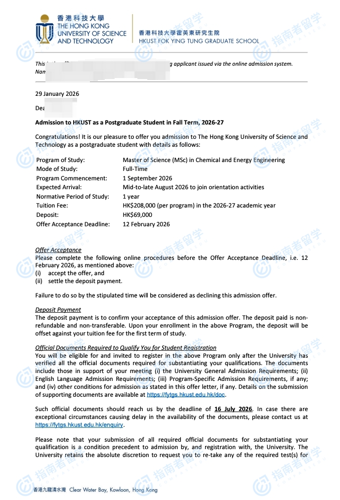 香港科技大学化学与能源工程理学硕士研究生offer一枚