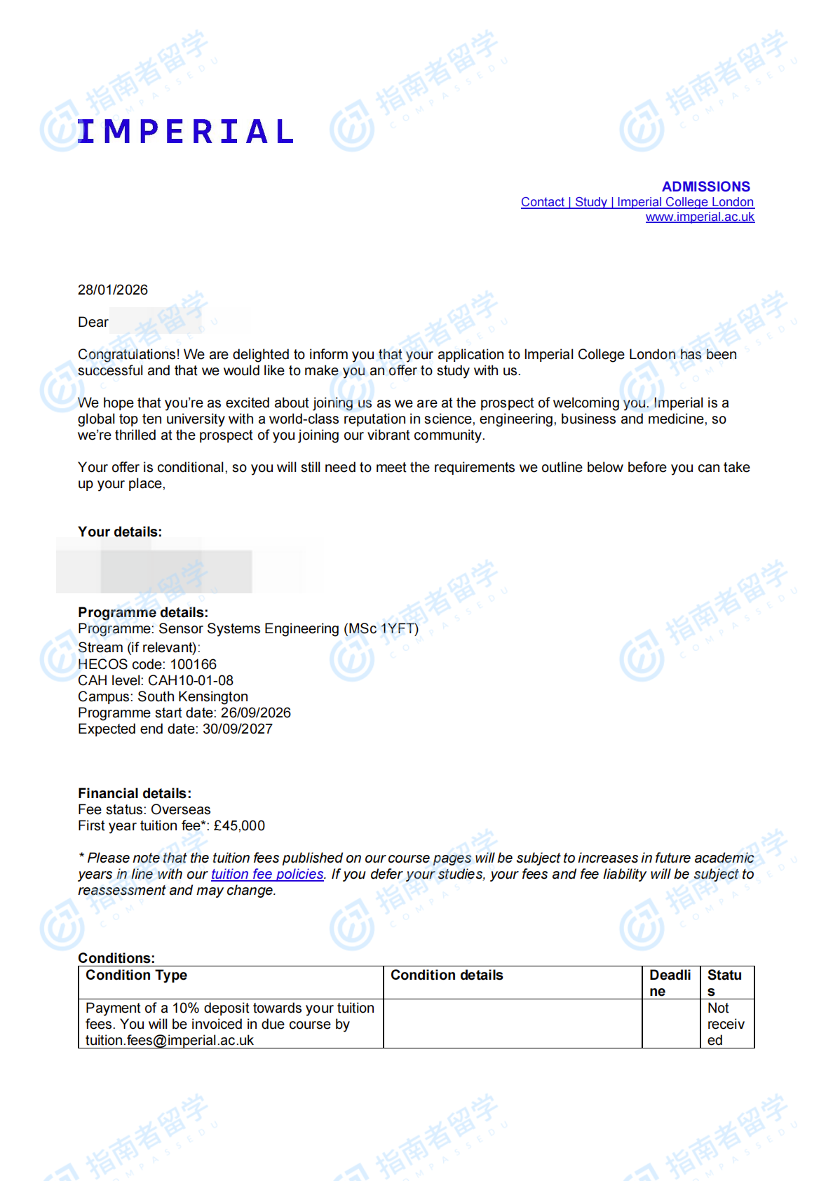 帝国理工学院传感器系统工程理学硕士研究生offer一枚