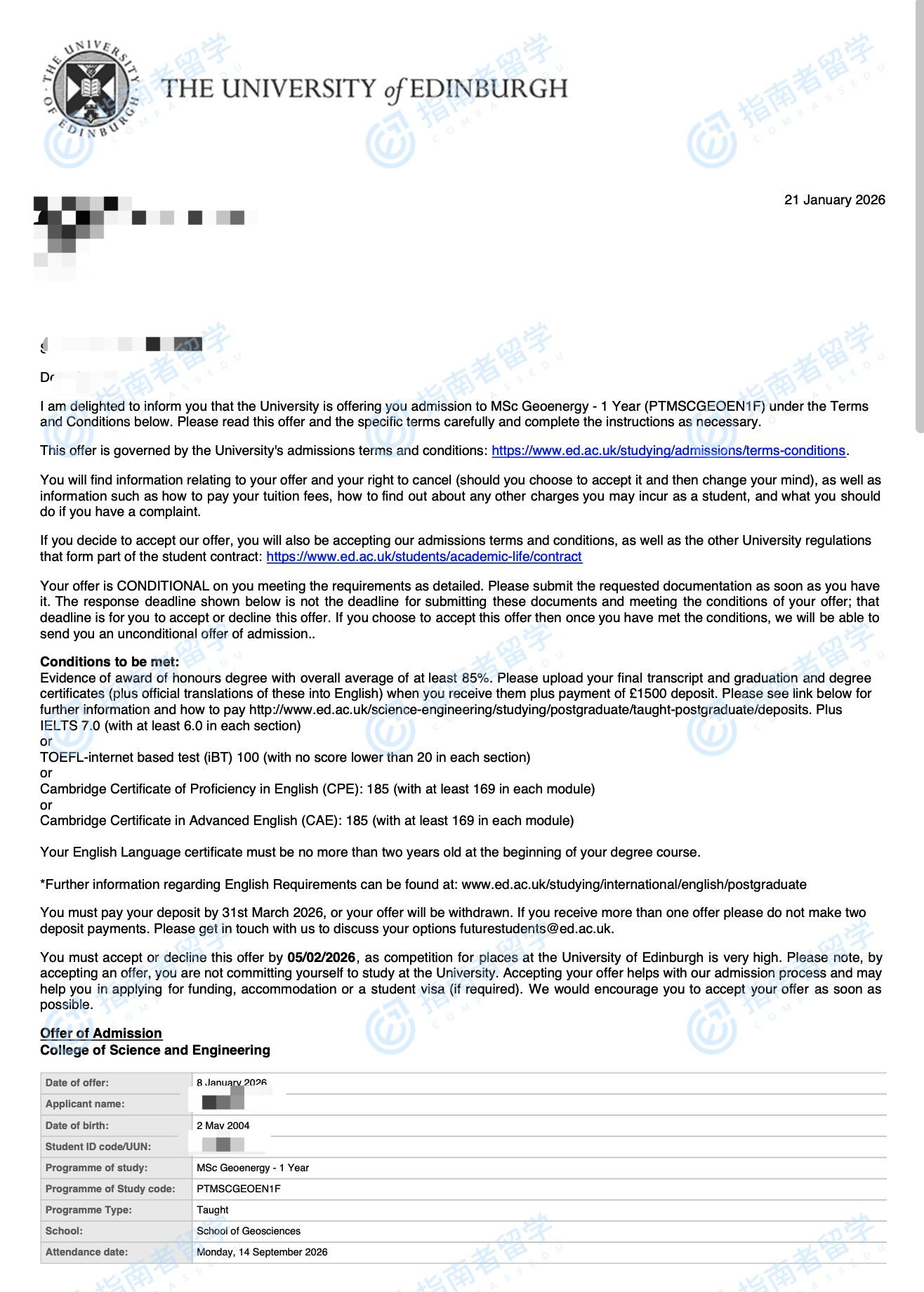 爱丁堡大学地球能源理学硕士研究生offer一枚