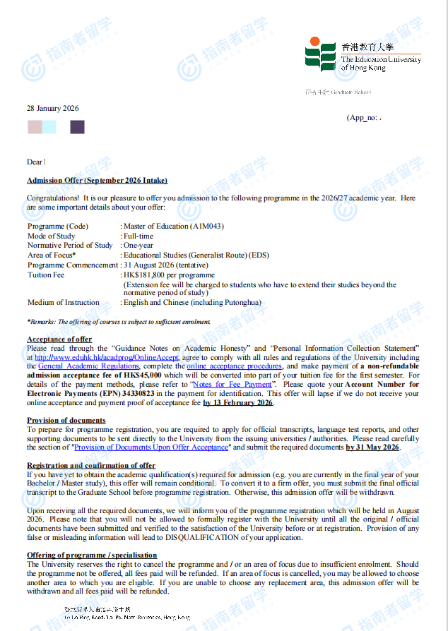 香港教育大学教育学硕士研究生offer一枚