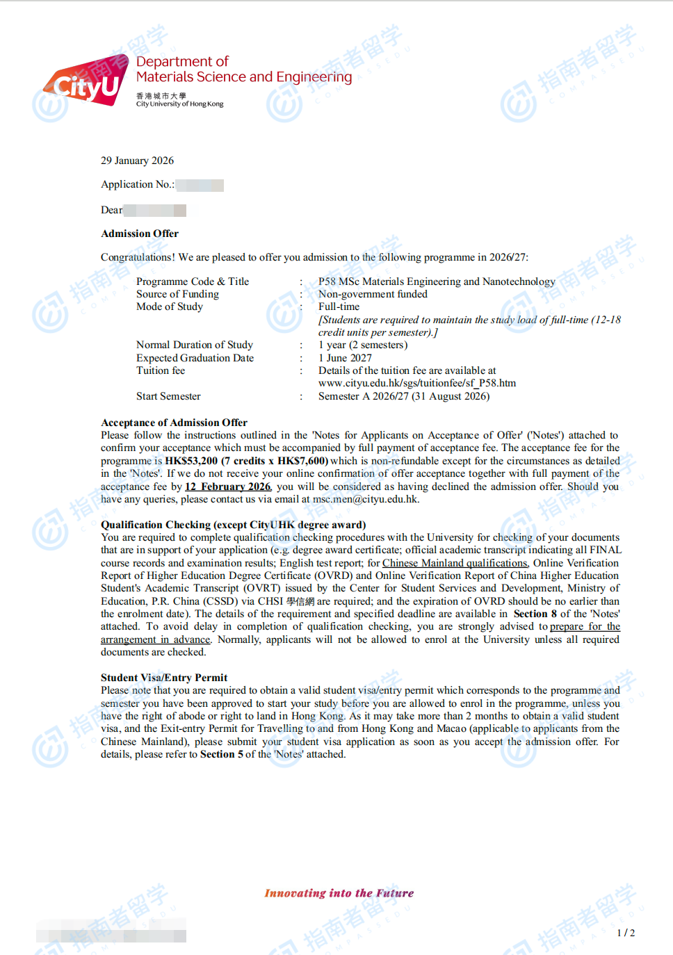 香港城市大学材料工程与纳米技术理学硕士研究生offer一枚