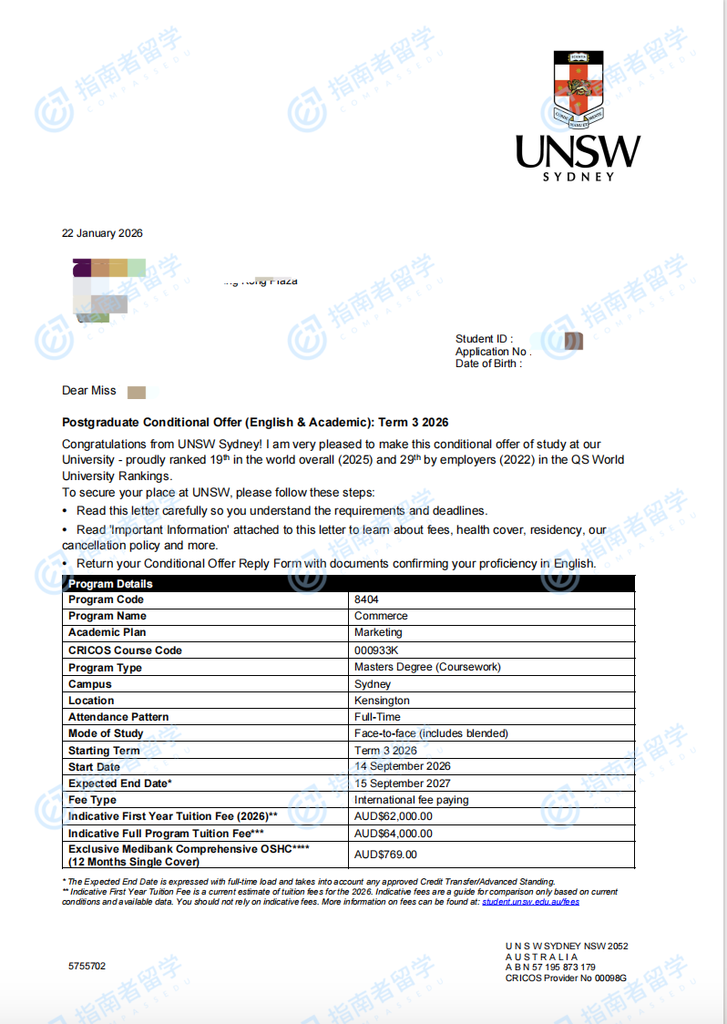 新南威尔士大学商学硕士研究生offer一枚