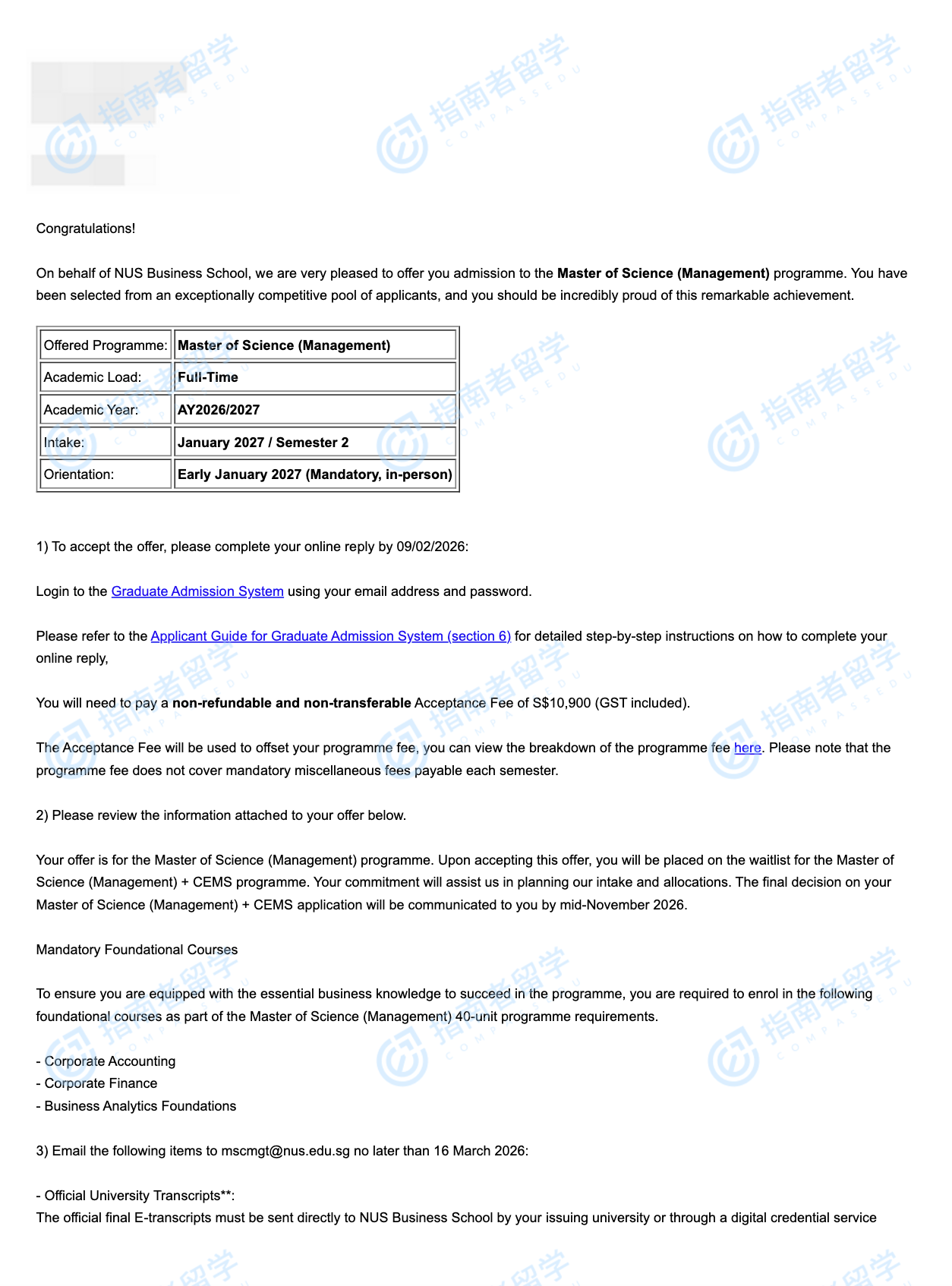 新加坡国立大学管理学理学硕士研究生offer一枚