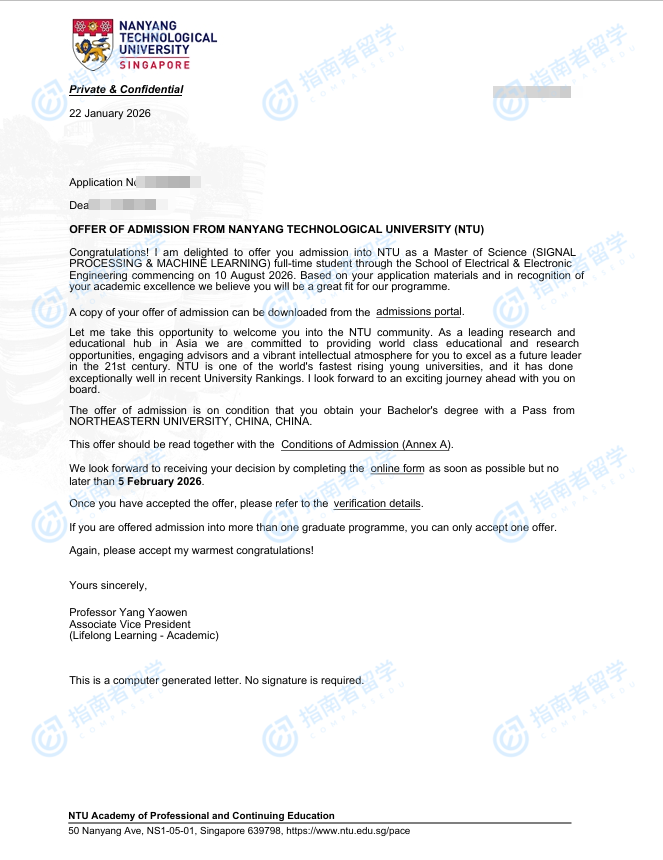 南洋理工大学信号处理和机器学习理学硕士研究生offer一枚