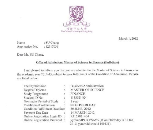 香港中文大学金融学理学硕士研究生offer一枚