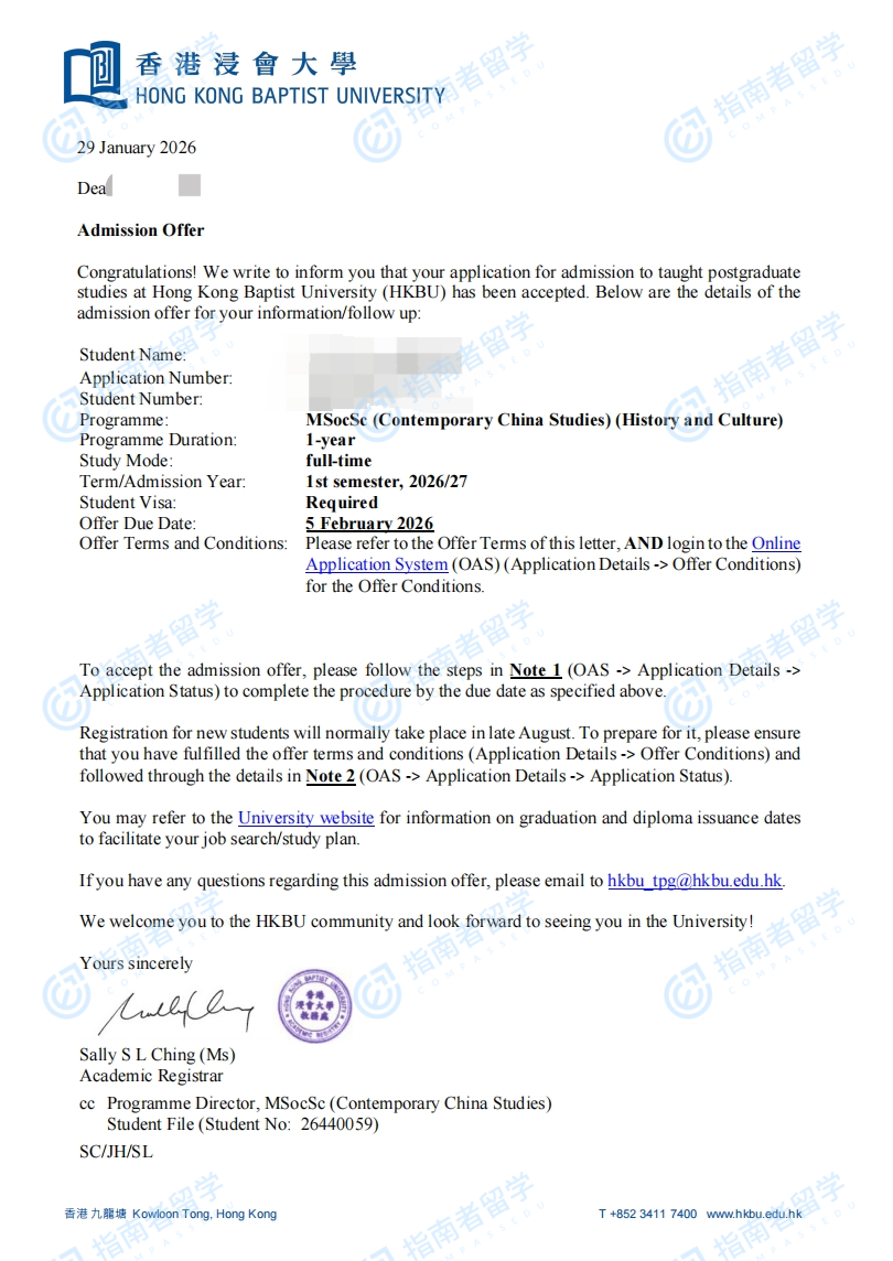 香港浸会大学当代中国研究社会科学硕士研究生offer一枚