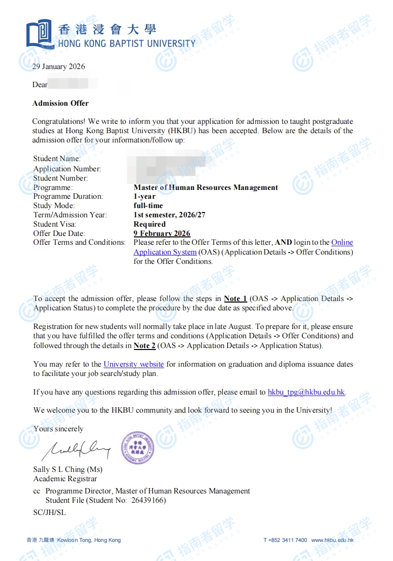 香港浸会大学人力资源管理硕士研究生offer一枚