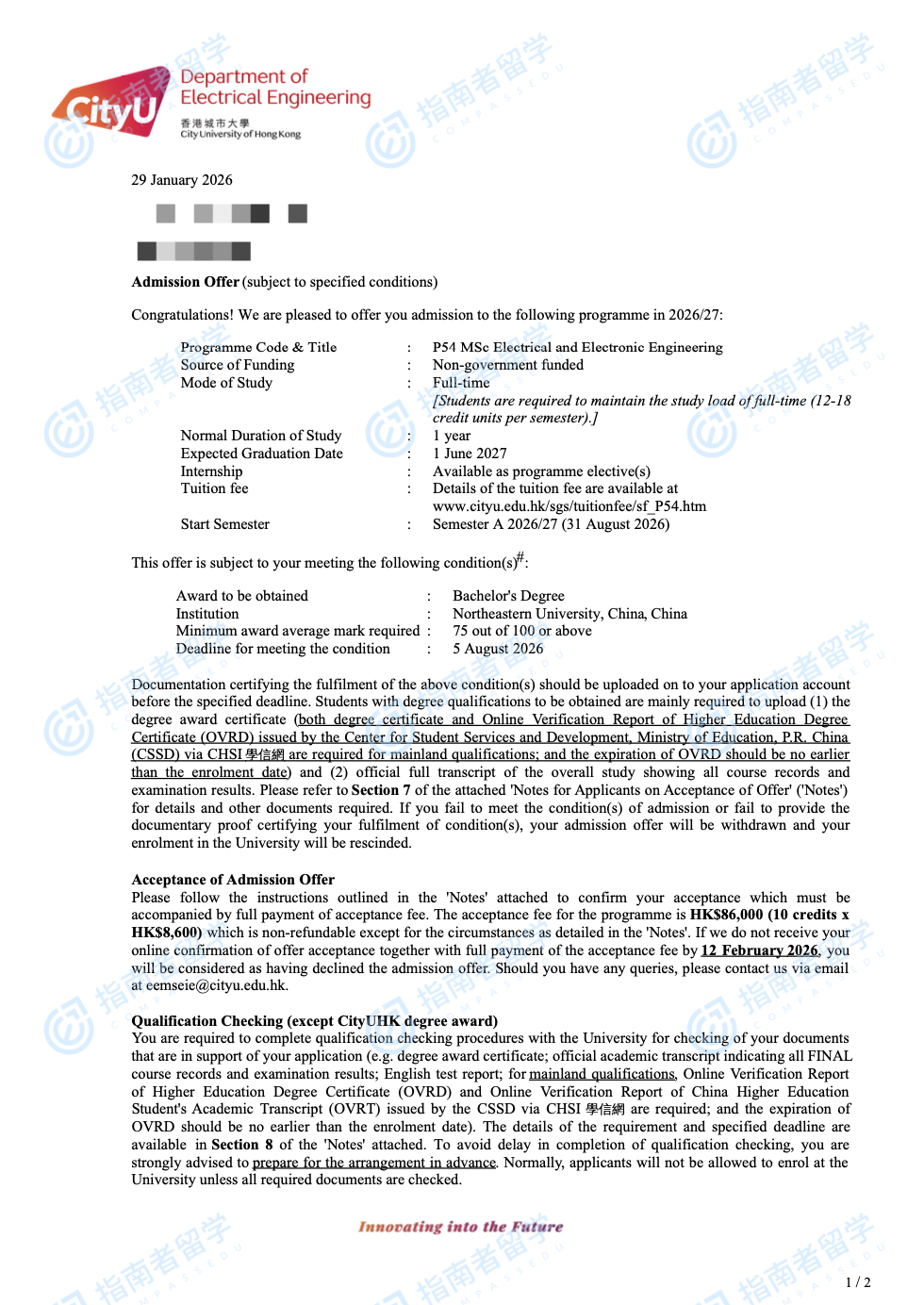 香港城市大学电机与电子工程学理学硕士研究生offer一枚