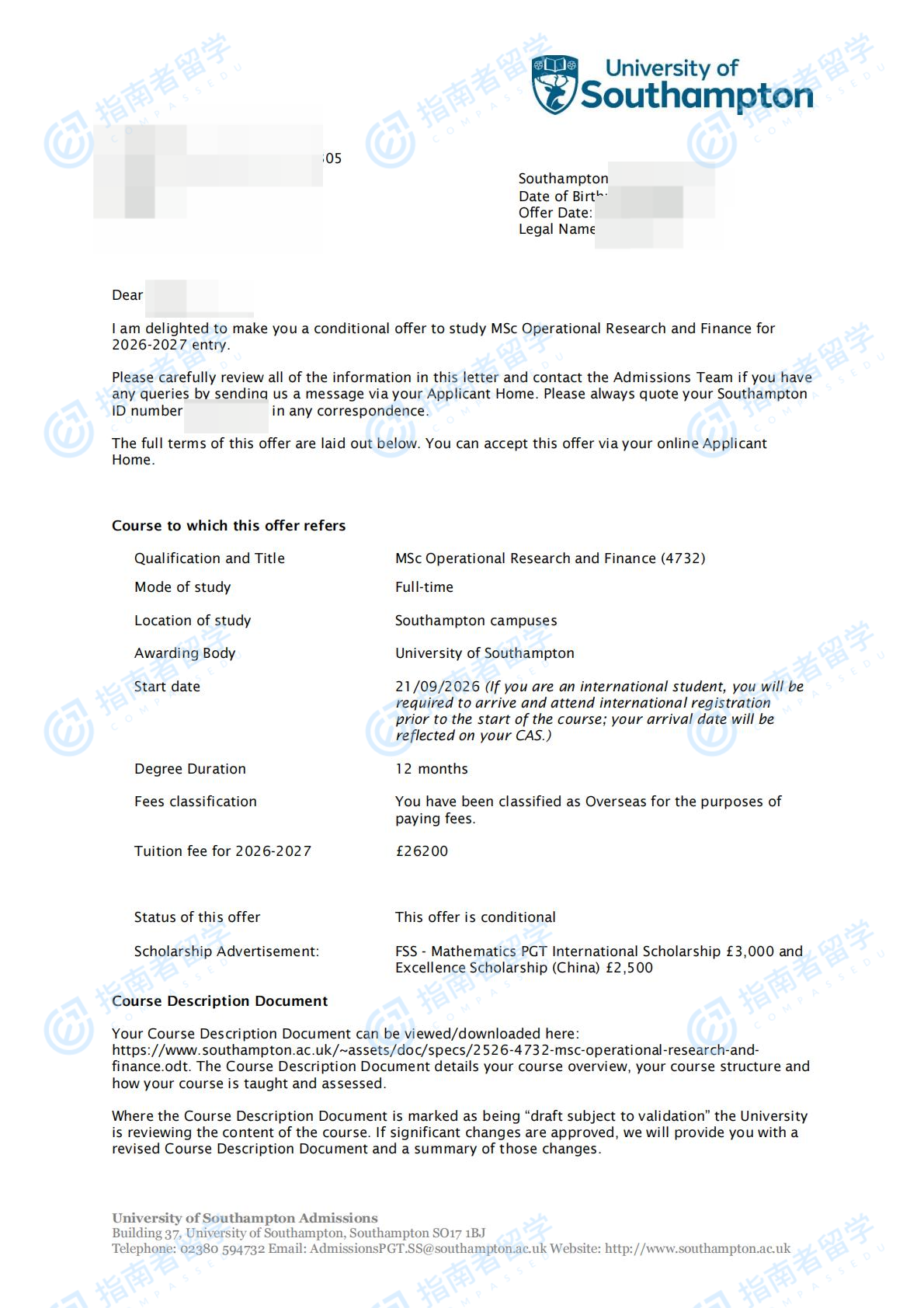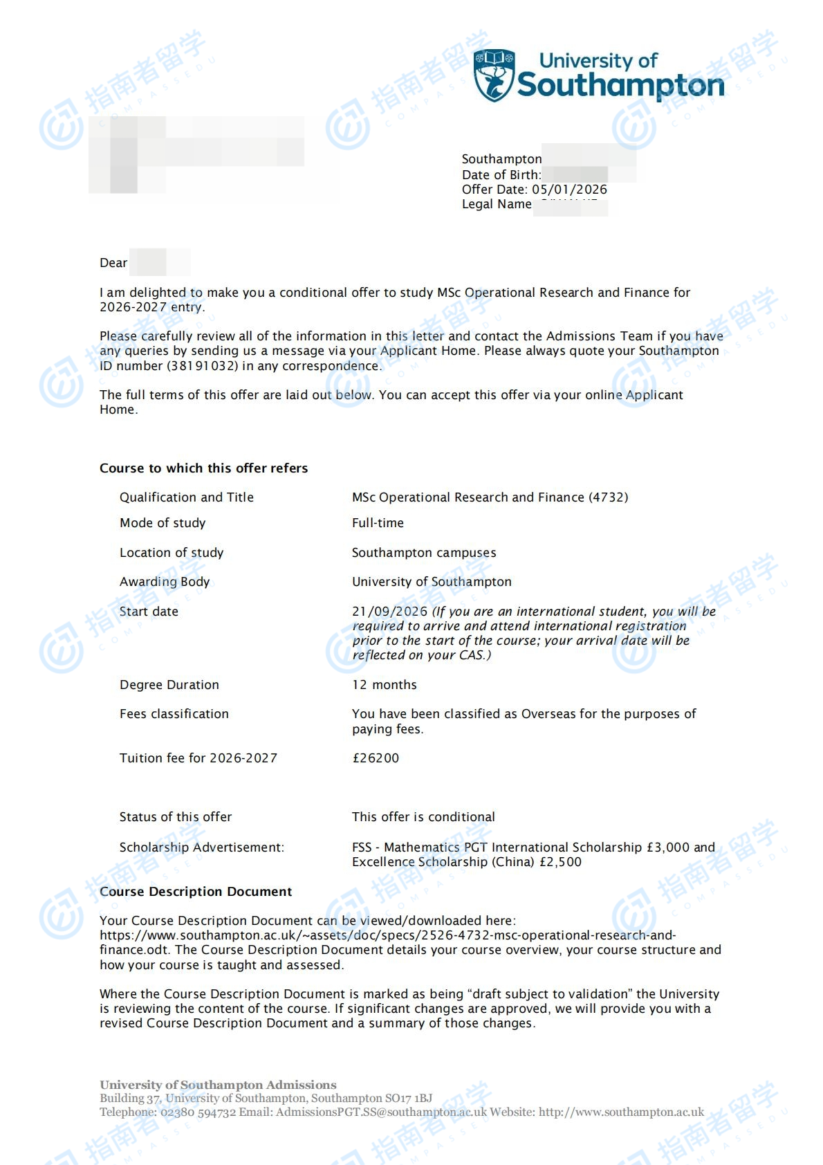 南安普顿大学运筹学与金融理学硕士研究生offer一枚