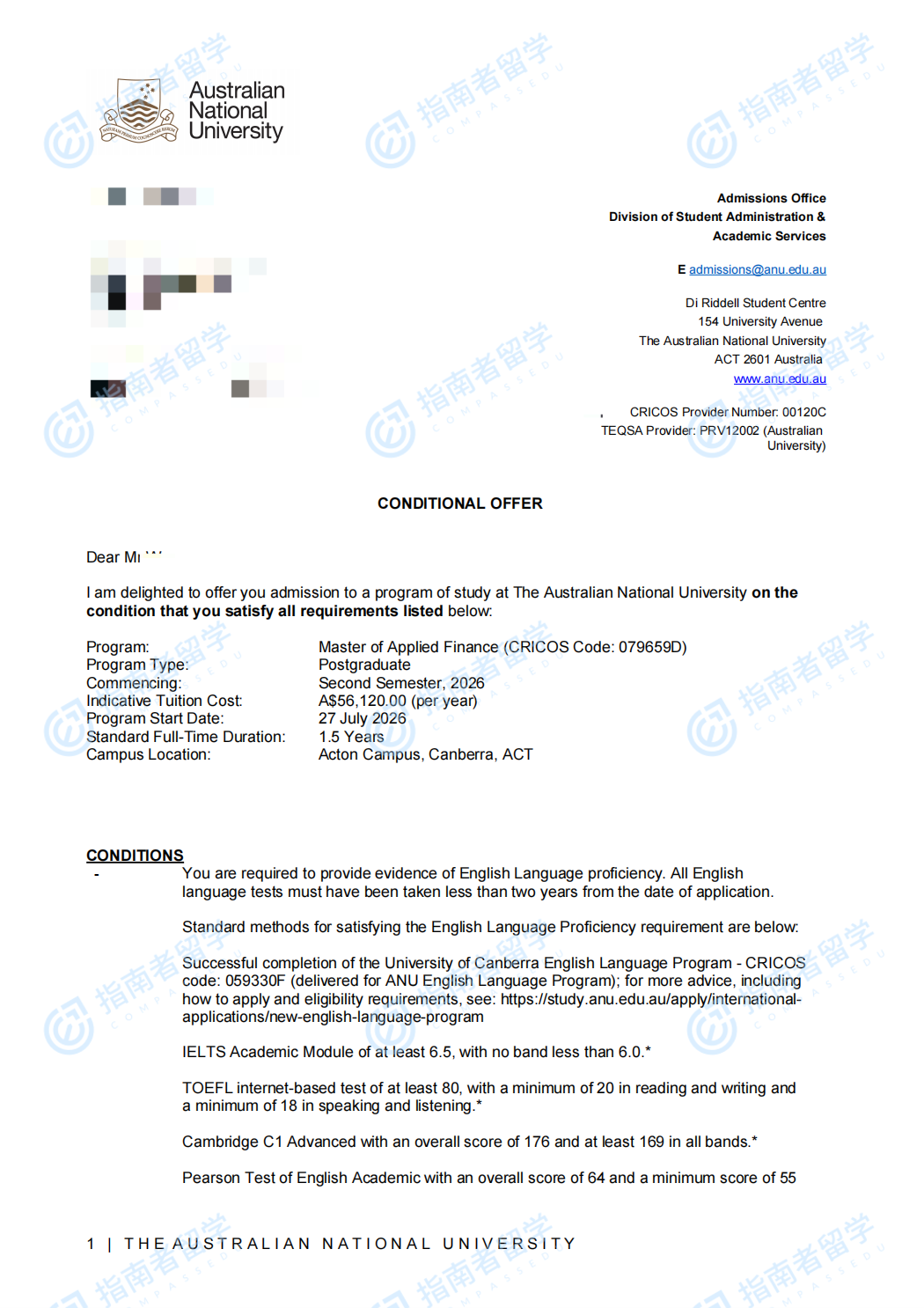 澳大利亚国立大学应用金融学硕士研究生offer一枚